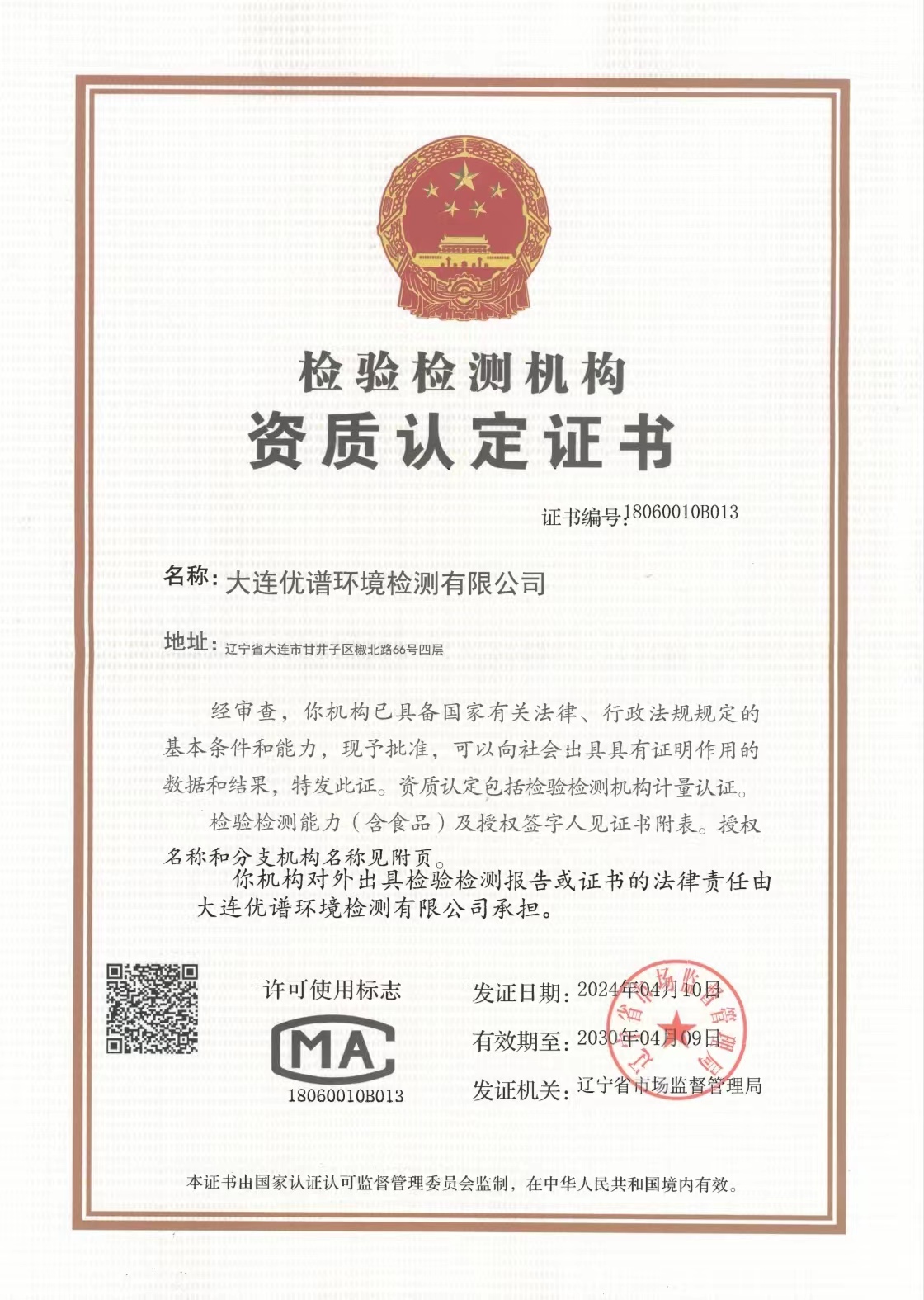 大連優(yōu)譜環(huán)境檢測有限公司環(huán)境檢測CMA資質(zhì)在遼寧省質(zhì)量技術(shù)監(jiān)督局網(wǎng)站上查詢。